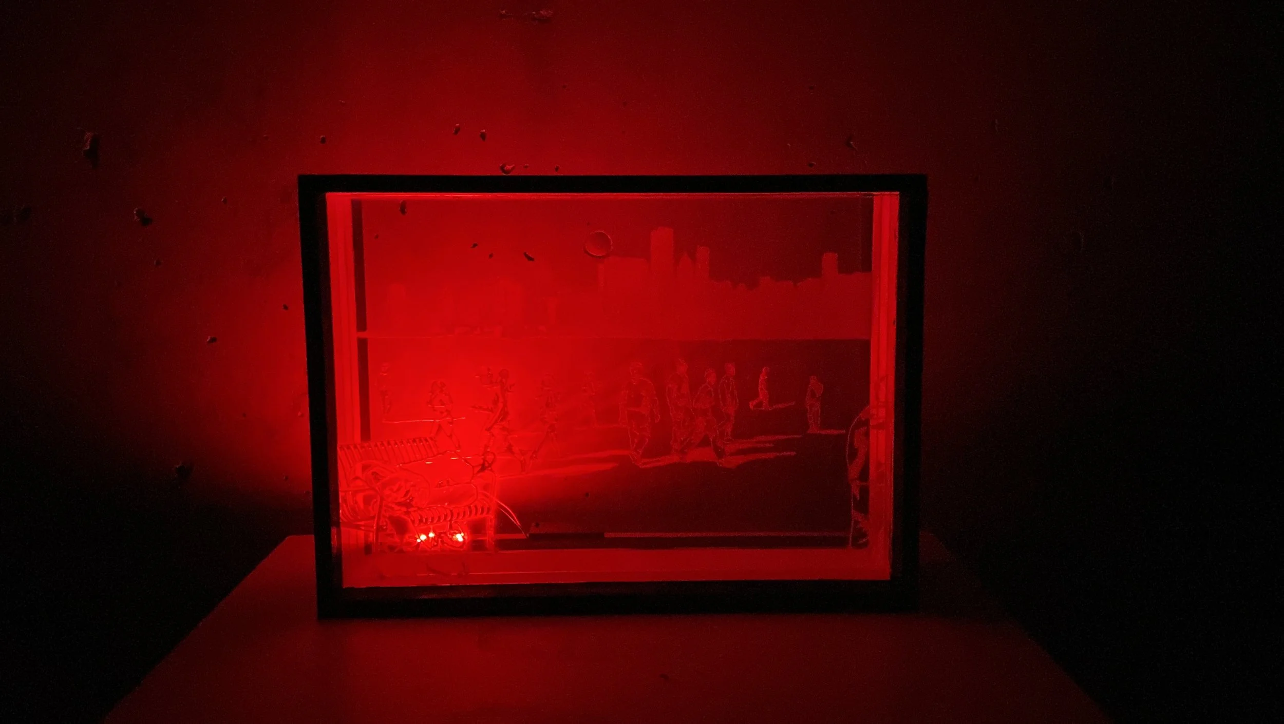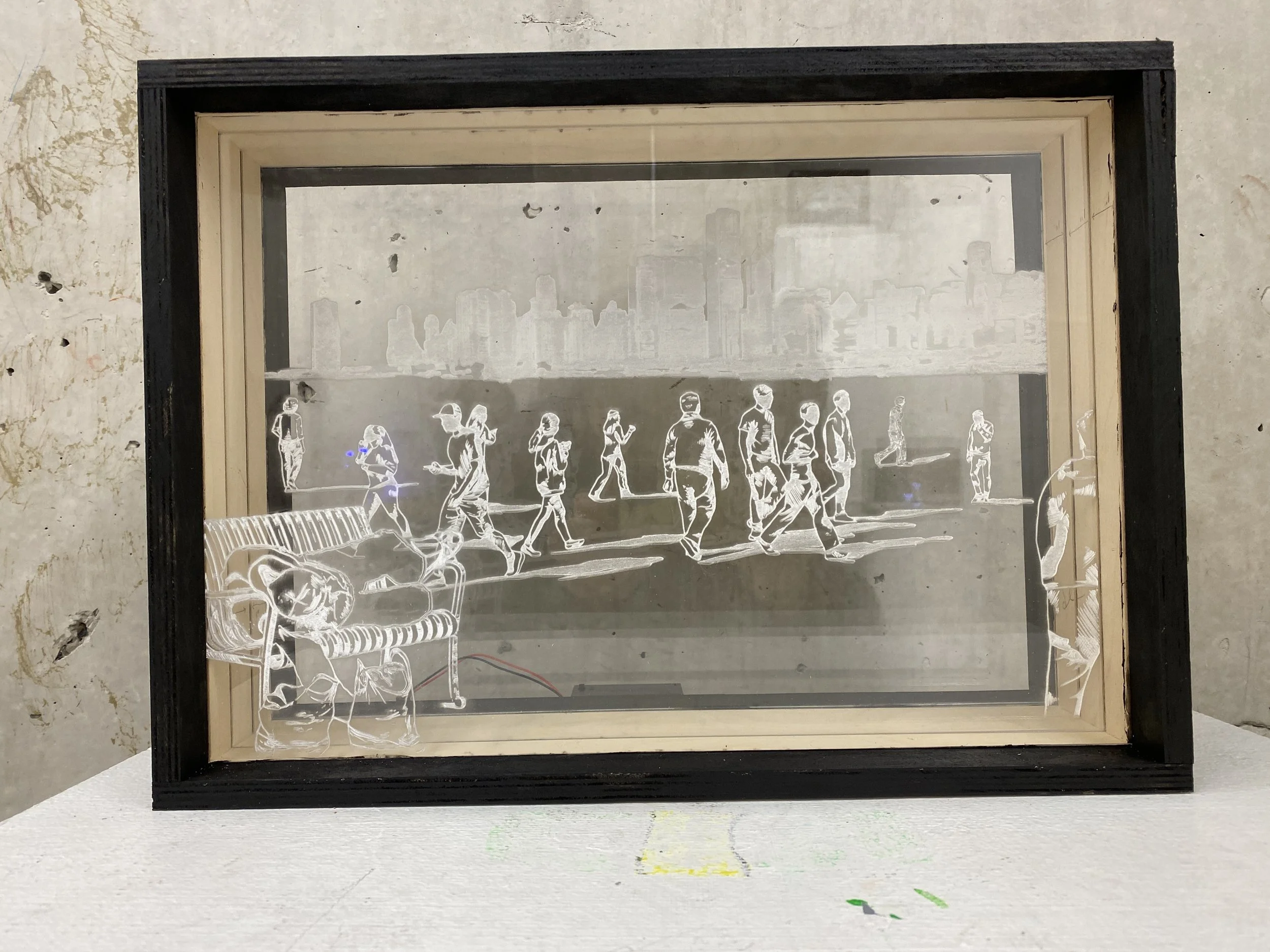The piece is made of 4 distinct acrylic panels. Each design is based on references but drawn digitally by myself. Illustrator was used to indicating which lines were to be etched or completely cut but the laser. The timing of the light and color itself was programmed by me and placed specifically on the man on the bench to increase his importance as a focal point.